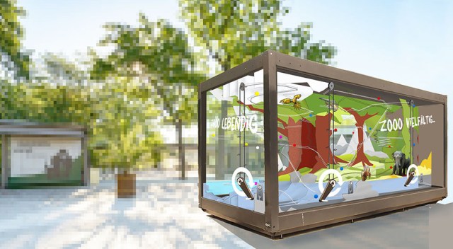 Die Kooglebaan, die wir für dem Berliner Zoo vorlegen konnten, präsentiert sich als großes interaktives Diorama in einem transportablen Gehäuse.